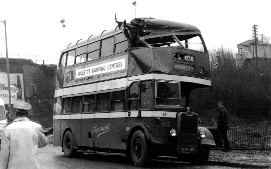 Like some other Provincial double deckers, No 20 came to grief under Fareham Station railway arch circa 1968. Following this incident it was repaired by Strachans and returned to service for a few more years. Photo: Stephen Didymus Collection